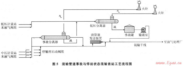 5) 在混輸首站,采用可隨時(shí)快速將油井產(chǎn)物的中壓氣液混輸流程轉(zhuǎn)換為中、低壓二級(jí)氣液分離流程的事故分離器過(guò)流運(yùn)行工藝,其工藝流程詳見(jiàn)圖4、5。