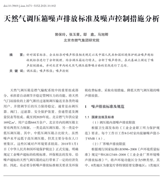 針對國家標準、企業(yè)標準對噪聲限值相關規(guī)定以及中國人民共和國環(huán)境保護稅法噪聲超標收稅標準進行了分析梳理。結合調壓箱運行特點,分析了噪聲特性,在此基礎上闡述了噪聲控制措施,并對北京市內的天然氣調壓箱降噪方面的實踐進行了總結。