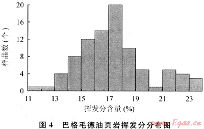 揮發(fā)分是油頁巖品質(zhì)好壞的一個重要指標(biāo),是指樣品在一定溫度條件下,隔絕空氣加熱一段時間,其有機質(zhì)分解放出的氣態(tài)有機質(zhì)即為揮發(fā)分。本次研究共對88件油頁巖樣品進行了揮發(fā)分分析,研究結(jié)果表明,巴格毛德油頁巖樣品揮發(fā)分的分布范圍為12%~23.1%,平均值為17.4%,主要集中在15%~19%之間(圖4)。