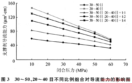 針對(duì)地應(yīng)力高、地層濾失大、裂縫寬度小的特點(diǎn),通過室內(nèi)30~50目和20~40目陶粒組合導(dǎo)流能力實(shí)驗(yàn)表明,30~50目和20~40目陶粒以1:4組合加入,不會(huì)顯著影響導(dǎo)流能力(導(dǎo)流能力降低小于10.0%),而可以以小粒徑陶粒填充窄裂縫,待形成一定寬度后再加入20~40目陶粒,可以提高施工成功率(圖3)。