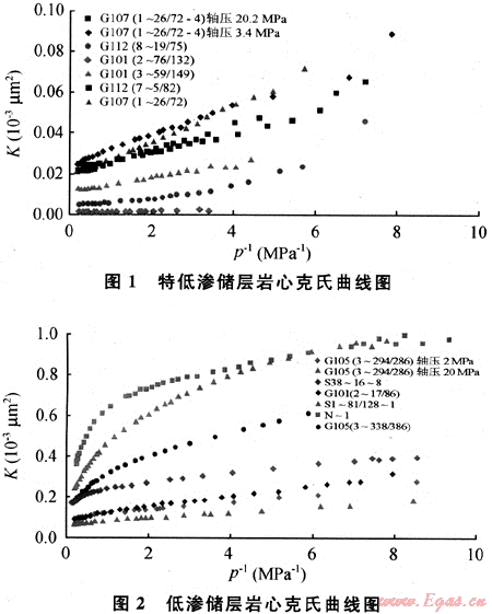 圖1、2是不同滲透率儲(chǔ)層單相氣體滲流典型特征曲線。圖1是特低滲透率(K<0.1×10-3μm2)儲(chǔ)層巖心克氏曲線的綜合表現(xiàn),氣體的滲流特征基本符合克氏滲流曲線特征,克氏滲流規(guī)律表達(dá)式為[4~5]:
