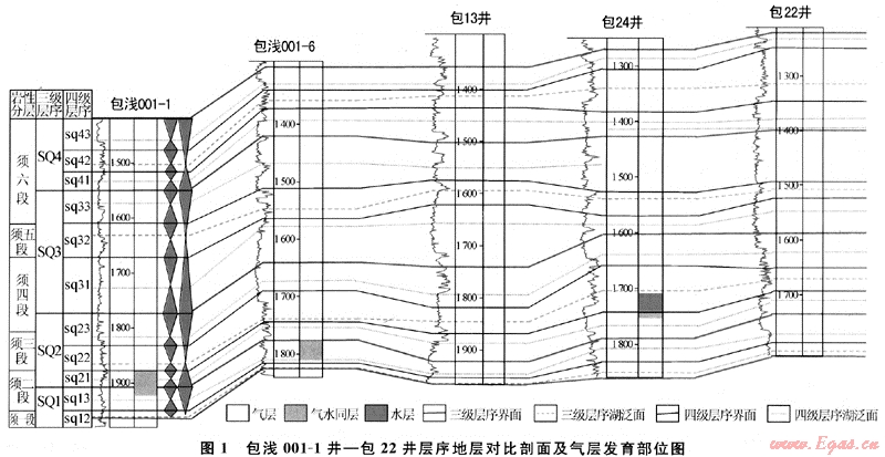 三級層序(SQ1~SQ4)的層序界面為不整合面或大型沖刷侵蝕面。層序界面在地震剖面中表現(xiàn)為削截與上超等反映地層不協(xié)調關系的地震反射,代表區(qū)域性的侵蝕間斷或無沉積型的間斷[2~4]。SQ1底界為須一段與下部嘉陵江組五段白云巖或雷口坡組二段石灰?guī)r的超覆不整合面。SQ4頂界為須六段與上部地層自流井不整合接觸面。SQ2、SQ3、SQ4的底界分別為發(fā)育于須二、須四、須六段大套砂巖內部的大型沖刷侵蝕面[5~6],其主要特征為:①底部存在礫石或者泥礫,礫石有時有定向排列,有時雜亂無章,這種泥礫層在剖面上可連續(xù)追蹤,自然伽馬曲線呈箱形或鐘形,底部呈突變接觸關系;②發(fā)育大規(guī)模的起伏不平的侵蝕面,侵蝕底面明顯下切到先前的沉積體中,下切深度一般為1m左右;③有時存在風化形成的黏土層或者菱鐵礦結核,此類現(xiàn)象出現(xiàn)在水上暴露的環(huán)境中;④有時存在大規(guī)模的植物莖干的堆積并且與其他巖性混雜在一起,此類現(xiàn)象一般發(fā)育在水下環(huán)境中的相對靜水湖灣地帶等;⑤有時發(fā)生物源的改變,比如由石英巖屑砂巖突變?yōu)殚L石巖屑砂巖,由于長石遭受風化而在露頭剖面上形成一個松軟帶。