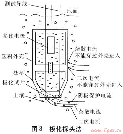 為克服上述兩種斷電法電位測量誤差大的缺陷,需要采用極化探頭法。極化探頭是把參比電極和填充介質封閉在絕緣外殼內,被測試片與絕緣外殼適當連接,試片外表面不被絕緣外殼包封而接觸探頭外部環(huán)境,內表面與探頭內部絕緣。參比電極只通過探頭底部多孔塞子滲透膜上的小孔與外界構成測量通路,參比電極與試片盡量接近,試片用和管道相同的材質制作。參比電極可分為液態(tài)參比電極(如Cu/飽和CuSO4、飽和甘汞)、固態(tài)參比電極(如Zn、MnO2等),根據(jù)測量對象采用不同參比電極。