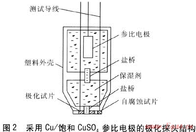 下面以Cu/飽和CuSO4參比電極探頭結構為例進行說明,探頭結構見圖2。該極化探頭分為上、下兩個腔室,上腔室為參比電極安裝室,下腔室安裝有極化試片、自腐蝕試片、保濕劑,上腔室與下腔室、下腔室與極化試片通過導電鹽橋連接[3]。極化探頭有3根導線分別與參比電極、極化試片、自腐蝕試片相連接。極化試片的連接導線既用作試片的極化線又兼作電位的測量線。
