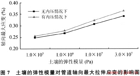 改變管溝內(nèi)土壤的彈性模量,計(jì)算得到的管道軸向最大拉伸應(yīng)變值,如圖7所示。計(jì)算結(jié)果表明:隨著管溝內(nèi)土壤的彈性模量的減小,管道所受的軸向拉伸應(yīng)變分別以11.05%、14.06%和7.82%的速率減小。據(jù)此可得到在軟土環(huán)境中管道可以抵抗更大的斷層位移,而在硬土環(huán)境中管道的拉伸應(yīng)變比較大的結(jié)論。