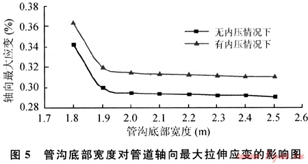 依據(jù)GB 50251—2003《輸氣管道工程設(shè)計(jì)規(guī)范》[8],深度在5m以內(nèi)時(shí),溝底寬度應(yīng)按下式確定:B=D+K,其中B為溝底寬度,m;D為管子外徑,m,該算例取1.219m;K為溝底加寬裕量,m,一般不少于0.5m。所以該算例中管溝底部寬度B≥1.719m(1.219m+0.5m),因此管溝底部寬度的最小值取1.8m。改變管溝底部寬度,計(jì)算得到的管道軸向最大拉伸應(yīng)變值如圖5所示。結(jié)果表明:隨著管溝底部寬度的增大,管道所受的軸向最大拉伸應(yīng)變減小,而且在從1.8m增加到1.9m時(shí)發(fā)生突變。由此可見管溝底部寬度取1.9m時(shí)比較經(jīng)濟(jì),再寬挖的意義不大。