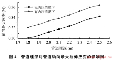 由于受凍土線的限制,管道埋深不宜淺于1.8m。改變管道埋深,計(jì)算得到的管道軸向最大拉伸應(yīng)變值如圖4所示。計(jì)算結(jié)果表明:隨著管道埋深的增加,管道受到的最大拉伸應(yīng)變有所增加。