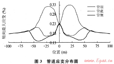 穿越該斷層的管道主要受軸向拉伸應(yīng)力作用,因而可在只控制管道軸向最大拉伸應(yīng)變情況下分析各參數(shù)對(duì)管道應(yīng)變的影響。管道軸向坐標(biāo)建立在管道穿越斷層處。在斷層作用下管道的應(yīng)變分布見圖3,從圖上可以看到管道最大應(yīng)變出現(xiàn)在斷層兩側(cè)30m范圍內(nèi)。