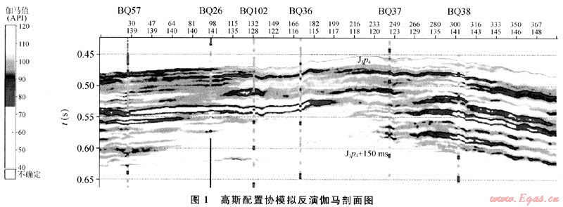 由于統(tǒng)計(jì)了多井點(diǎn)樣本數(shù)據(jù)的地質(zhì)、地震特性,在儲(chǔ)層屬性建模中進(jìn)行約束,這優(yōu)化了對(duì)儲(chǔ)層的模擬。從利用該模塊反演的過井Gamma剖面看,其整體面貌好,但個(gè)別井始終對(duì)應(yīng)不好(如BQ36井)。