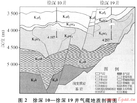 實(shí)測資料顯示徐家圍子斷陷徐南地區(qū)目前發(fā)現(xiàn)有2口井存在超壓現(xiàn)象,分別為徐深19井和徐深10井,超壓層位為下白堊統(tǒng)營城組一段(表1)。通過研究這兩口井的氣藏地質(zhì)剖面來分析該地區(qū)超壓的形成原因(圖2)。