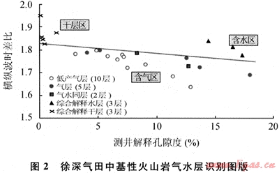 理論上當(dāng)?shù)貙雍瑲鈺r(shí),由于天然氣比液體更容易壓縮,因此含氣巖石的縱波速度一般比含液體巖石的速度低,即縱波時(shí)差(△Tc)在氣層處變大;而橫波時(shí)差(△Ts)卻變化極小。同時(shí)由于地層巖性、物性的變化同樣也可能引起速度的改變,因此單純應(yīng)用縱波時(shí)差去識(shí)別天然氣,存在著一定的風(fēng)險(xiǎn)性,但如果通過比較橫波和縱波的速度差異來判別氣層,則要可靠得多。故可據(jù)此來進(jìn)行流體識(shí)別。