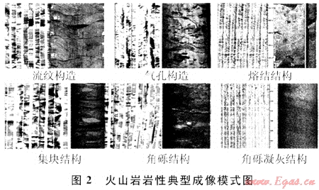 徐深氣田火山巖巖性成因復雜,即使巖石化學成分相同,但如果結構、構造不同,其巖石類型也會不同。而應用交會圖版法雖然可以識別成分不同的巖性(如酸性巖、中性巖和基性巖等),但對于成分相同、而結構或構造不同的巖性如流紋質熔結凝灰?guī)r、角礫凝灰?guī)r、火山集塊巖、火山角礫巖這些火山巖巖性識別效果較差,對這類巖性必須結合成像測井進行識別。圖2為火山巖典型成像模式圖。