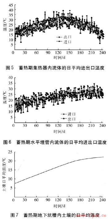 蓄熱期集熱器內(nèi)流體的日平均進(jìn)出口溫度、水平埋管內(nèi)流體的日平均進(jìn)出口溫度、地下坑槽內(nèi)土壤的日平均溫度見圖5~7。