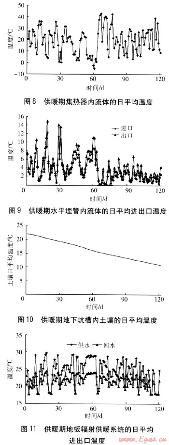 供暖期集熱器內(nèi)流體的H平均溫度、水平埋管內(nèi)流體的日平均進(jìn)出口溫度、地下坑槽內(nèi)土壤的日平均溫度、地板輻射供暖系統(tǒng)日平均進(jìn)出口溫度、日總供熱量與日總熱負(fù)荷、室內(nèi)日平均溫度見圖8~13。