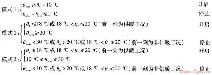 系統(tǒng)主要由平板型太陽能集熱器、地下坑槽內(nèi)的水平埋管換熱器、熱泵機(jī)組、地板輻射供暖系統(tǒng)等組成。系統(tǒng)在全年運行中,主要有以下4種運行模式: