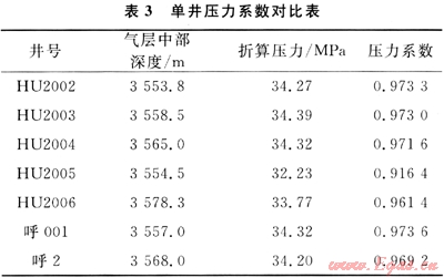 根據單井初期不穩(wěn)定試井資料,將氣井初期地層壓力折算至統(tǒng)一海拔深度,扣除投產時間晚2a的HU2005井和HU2006井,其余井壓力系數(shù)在0.9716~0.9736之間(表3),相對偏差較小,在0.05%~0.1%,說明未投產前各井同屬一個壓力系統(tǒng)。