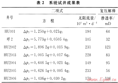 應用壓力恢復、壓降、系統(tǒng)試井和一點法等多種試井方法研究儲層物性及產能特點。確定了各氣井較為真實可靠的產能方程(表2),為新井配產提供了依據;同時,運用三維建模和數(shù)值模擬技術,確定了合理井距為1400m,為實現(xiàn)稀井高產創(chuàng)造了條件。