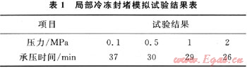 管道局部封堵的原理是通過向管道中放入具有一定強(qiáng)度的封堵物,利用其與管道壁面之間的摩擦力或結(jié)合力來實(shí)現(xiàn)局部封堵,皮囊封堵與機(jī)械封堵均屬于這一范疇。局部冷凍封堵通常是將管道中可凍結(jié)的流體冷凍,通過冷凍段來承受壓力,起到隔離的作用。小管徑天然氣管道要采用冷凍封堵,必須先注入可凍結(jié)流體(常用的可凍結(jié)流體是水),再進(jìn)行冷凍。為了驗(yàn)證水變成冰后自身的承壓能力以及與管壁的結(jié)合力能否承受較高的氣壓,筆者在Φ60mm×8mm的試驗(yàn)管道內(nèi)密封一段長100mm水柱,將試驗(yàn)管道放于冰柜中進(jìn)行冷凍,使水凍成冰,再在室溫(15℃)下加氣壓,進(jìn)行局部冷凍封堵模擬試驗(yàn),試驗(yàn)結(jié)果見表1。