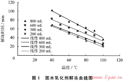 分別取固水乳化劑800mL、500mL、300mL、200mL,將它們冷凍固化后,看其是否產(chǎn)生裂紋;在不同的溫度下解凍,獲取解凍時(shí)間。試驗(yàn)結(jié)果見表2和圖1。試驗(yàn)結(jié)果表明固水乳化劑解凍后恢復(fù)成原來的膏狀,且具有良好的質(zhì)密性。