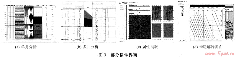 井分析插件包括合成記錄、地質(zhì)層位標(biāo)定、AVO分析、流體替換、交會分析等單井分析以及地層對比、砂體對比分析等多井分析功能。構(gòu)造解釋插件主要包括速度場構(gòu)建、2D/3D構(gòu)造解釋、全三維可視化解釋、時(shí)深轉(zhuǎn)換等。屬性儲層預(yù)測插件包括常規(guī)屬性及特殊屬性提取、屬性優(yōu)化、儲層預(yù)測。地質(zhì)繪圖插件包括數(shù)據(jù)網(wǎng)格化、等值線繪制、構(gòu)造成圖等功能。圖3為插件的部分界面。