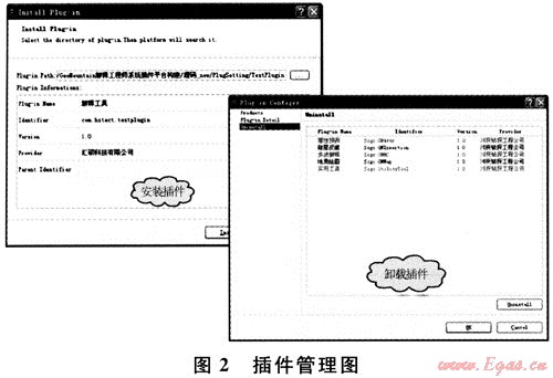 插件平臺是整個系統(tǒng)的核心,是功能插件實(shí)現(xiàn)的基礎(chǔ)。插件平臺包含重要的核心組件,分別有運(yùn)行時(shí)核心、工作臺GUI、項(xiàng)目管理、幫助系統(tǒng)數(shù)據(jù)管理和平臺數(shù)據(jù)業(yè)務(wù)等。插件平臺不包含具體的功能實(shí)現(xiàn),只為功能插件提供運(yùn)行環(huán)境、實(shí)現(xiàn)接口及數(shù)據(jù)管理,而插件實(shí)現(xiàn)其業(yè)務(wù)功能要依賴平臺接口。插件通過平臺安裝的方式安裝入平臺中,同時(shí)平臺也提供插件管理功能,如卸載插件等(圖2)??梢院芎玫亟鉀Q軟件開發(fā)與集成問題,適用高級版和低級版的軟件安裝,這對程序組織開發(fā)十分方便。軟件系統(tǒng)采用C++語言的跨平臺GUI工具包QT開發(fā)[2~3],可運(yùn)行于Windows、Linux、Unix等多個平臺之上。