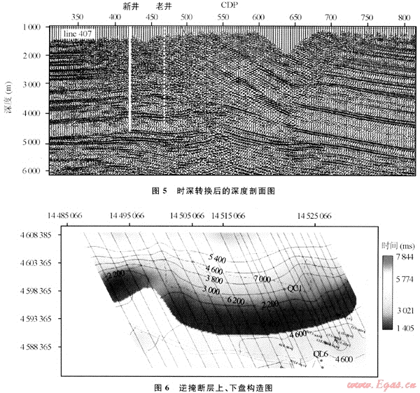 GeoMountain解釋軟件系統(tǒng)在10多個項(xiàng)目中得到了廣泛應(yīng)用,取得較好效果。圖4為西部某工區(qū)構(gòu)建的地下速度模型,經(jīng)時(shí)深轉(zhuǎn)換后得到深度剖面。由于準(zhǔn)確的速度場構(gòu)建,消除了時(shí)間剖面的構(gòu)造假象,恢復(fù)了地下復(fù)雜構(gòu)造的真實(shí)形態(tài)(圖5)。圖6為某層的逆掩斷層構(gòu)造成圖,它同時(shí)刻畫了斷層上、下盤包括逆掩部分的構(gòu)造形態(tài)。