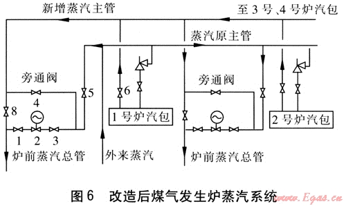 針對以上問題,我們對蒸汽系統(tǒng)進行了改進:①重新布置1根長度為40m、外徑為108mm的無縫鋼管作為自產蒸汽的主管道(即新增自產蒸汽主管)。②將4臺煤氣發(fā)生爐汽包的出汽管與原主管分開后,接到新增自產蒸汽主管上。③在新增自產蒸汽主管至每臺煤氣發(fā)生爐飽和管之間加1個DN 100mm的截止閥(8號閥)。④將原來旁通閥(4號閥)由截止閥改為閘閥。改造后煤氣發(fā)生爐蒸汽系統(tǒng)見圖6。