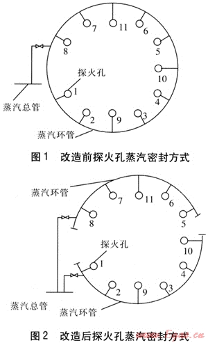 改造方案是:將原來的蒸汽環(huán)管從中間截斷成兩半,一半沿用原來的探火蒸汽管和閥門,只是將兩端用堵頭堵住,主要用來密封5、6、7、8、11號探火孔;用1根直徑為40mm的無縫鋼管從蒸汽總管引至另一半環(huán)管上,加裝1個DN 40mm的截止閥作為控制用,這一半環(huán)管主要用來密封1、2、3、4、9、10號探火孔。經過這一改進后,提高了密封煤氣的蒸汽壓力,解決了在探火時因蒸汽壓力較低而造成密封效果較差、煤氣泄漏嚴重的問題。