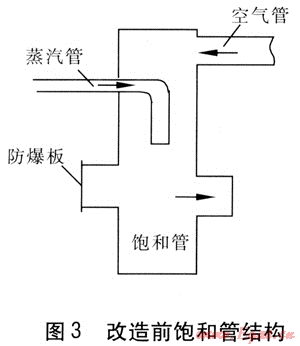 ④ 飽和管上裝有1塊0.5mm厚的退火鋁板作為防爆板,用于爐底部發(fā)生爆炸時泄壓。一方面,發(fā)生爐爐底爆炸時由于該防爆板采用平裝方式(見圖3),爆炸波和鋁片易傷到人;另一方面,蒸汽凝結水易對鋁板造成腐蝕,導致鋁板使用壽命縮短。