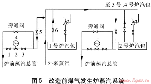 外來蒸汽的壓力一般在0.8MPa左右,經過減壓閥減壓后最低保持在0.15MPa左右。煤氣發(fā)生爐自產蒸汽的壓力一般在0.045MPa左右,設計壓力不超過0.075MPa,經過汽包匯集后與減壓后的外供蒸汽一起進入爐前蒸汽總管。改造前煤氣發(fā)生爐蒸汽系統(tǒng)見圖5。由于兩者壓力之差,導致外供蒸汽流入煤氣發(fā)生爐汽包,造成煤氣發(fā)生爐的自產蒸汽無法進入爐前蒸汽總管,汽包安全閥長年處于開啟放散狀態(tài),從而使大量的蒸汽浪費,存在汽包壓力持續(xù)超過設計要求的不安全因素。