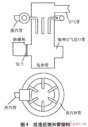 改變蒸汽進入飽和管的方式,首先在飽和管外部加1根管徑為100mm的環(huán)形管,環(huán)形管上接1段長度為200mm、直徑為200mm的緩沖管,使蒸汽在緩沖管內得到緩沖,然后將蒸汽由6根直徑為40mm的支管引入飽和管,在每根支管上分別鉆12個直徑為14mm的孔(靠飽和管內壁一側不鉆孔),支管末端出口用盲板堵住。改造后飽和管結構見圖4。通過以上改造,實現(xiàn)了蒸汽和空氣的充分混合,提高了氣化劑的品質,從而改善了爐內氣化狀況。