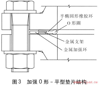 第3種結(jié)構(gòu)為加強(qiáng)0形-平型墊片,將上述第2種結(jié)構(gòu)的金屬骨架取消,在外側(cè)加裝金屬加強(qiáng)環(huán),見(jiàn)圖3。這種結(jié)構(gòu)的墊片由橡膠半橢圓形橡膠環(huán)、O形橡膠圈、金屬支架、金屬加強(qiáng)環(huán)組成,金屬支架與金屬加強(qiáng)環(huán)為一個(gè)整體,半橢圓形橡膠環(huán)與O形橡膠圈為一個(gè)整體,O形橡膠圈的直徑為半橢圓形橡膠環(huán)厚度的1.2~1.5倍。金屬加強(qiáng)環(huán)的厚度為半橢圓形橡膠環(huán)厚度的0.7倍。半橢圓形橡膠環(huán)外側(cè)的凹槽與金屬支架承插連接。推薦在4.0MPa設(shè)計(jì)壓力下使用這種結(jié)構(gòu)形式的墊片。