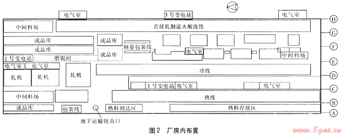 不銹鋼冷軋薄板工程占地面積約14×104m2,廠房總長(zhǎng)度為690m,總寬度為204m,由相鄰的多跨車間組成。總建筑面積為12.861×104m2,其中熱板坯車間建筑面積為14490m2,該車間不供暖。其他車間建筑面積為11.412×104m2,為供暖區(qū)域。由于供暖區(qū)域內(nèi)包括磨輥間、變電站、成品庫(kù)等不需供暖的部位,因此為簡(jiǎn)化問(wèn)題,供暖面積按11×104m2考慮。不銹鋼冷軋薄板廠房設(shè)置及廠房?jī)?nèi)布置分別見(jiàn)圖1、2。
