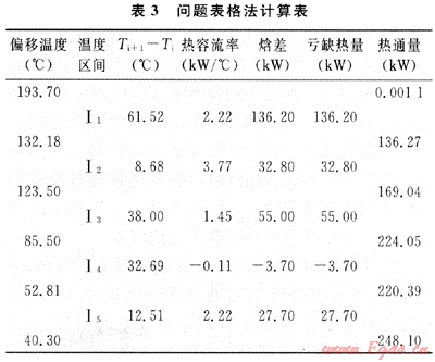 表3為應用問題表格法計算換熱網絡所需公用工程量和夾點位置。換熱網絡的夾點位于193.70℃,加熱量為0kW,冷卻量為248.10kW。