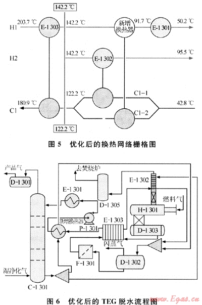 根據夾點設計規(guī)則[5],構建最大能量回收換熱網絡(MER),將C1物流按熱容流率分成0.92kW/℃(C1-1)和1.41kW/℃(C1-2)兩股物流,C1-1物流通過換熱器E-1302與再生氣(H2)換熱到122.20℃,C1-2物流通過新增換熱器與貧TEG溶液(H1)換熱到122.20℃,然后兩股物流合并成一股通過換熱器E-1303與貧TEG溶液(H1)換熱到180.90℃,貧TEG溶液(H1)剩余熱量通過冷卻器E-1301將其溫度從91.7℃降到50.2℃。圖5、6為優(yōu)化后的換熱網絡柵格圖和工藝流程圖。