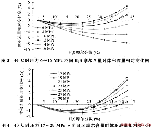 圖3、4分別給出了基于前述基準(zhǔn)條件,40℃時(shí)壓力為6~16MPa、17~29MPa和不同H2S摩爾分?jǐn)?shù)含量時(shí)體積流量相對(duì)變化情況。由圖3、4可知:在所列H2S摩爾分?jǐn)?shù)范圍內(nèi),隨著H2S含量增加,6~8MPa范圍內(nèi)體積流量變化始終負(fù)增長(zhǎng),呈下降趨勢(shì);12~16MPa,17~27MPa的體積流量變化均開(kāi)始負(fù)增長(zhǎng),后正增長(zhǎng);10MPa時(shí)與29MPa時(shí)類似,分別在H2S摩爾分?jǐn)?shù)為25%、20%附近時(shí)體積流量降至最低,分別降低3%和1.6%。
