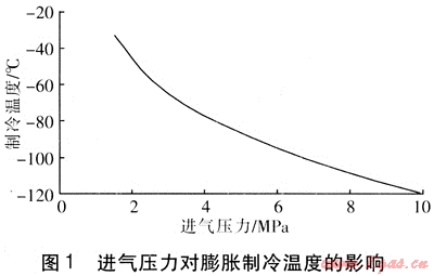 p1越高,膨脹制冷溫度就越低。當(dāng)高壓甲烷的壓力為4.0MPa時,等熵膨脹可獲得-77.6℃的低溫。通過預(yù)冷進氣、逐級膨脹,可以獲得溫度更低、品位更高的冷能。當(dāng)進氣被預(yù)冷到-5℃時,壓力由4.0MPa降為0.5MPa能得到-100.7℃的低溫;當(dāng)進氣被預(yù)冷到-20℃時,可得到-112.3℃的深冷低溫。