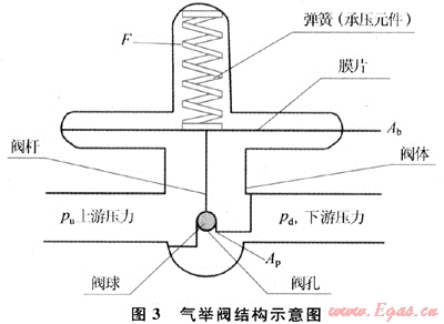 在封隔器以上的最下一級(jí)氣舉閥為工作閥,其他則為排液閥。排液閥在油井投產(chǎn)初期當(dāng)油套環(huán)空排液時(shí)工作,地面高壓氣舉氣流進(jìn)工作閥后,油管內(nèi)壓力大幅下降,套管內(nèi)注氣壓力也相應(yīng)下降,排液閥隨即關(guān)閉,停止工作。工作閥選用BK空閥,把正常的氣舉閥(圖3)卸開(kāi)取出閥芯(彈簧、膜片、閥桿、閥球)即為空閥,其特點(diǎn)是保證氣舉閥常開(kāi),當(dāng)?shù)孛孀鈮毫υ谝欢ǚ秶▌?dòng)時(shí),氣舉工作閥不受影響,可保持連續(xù)注氣,同時(shí)避免了注氣點(diǎn)上移問(wèn)題,保證了氣舉井平穩(wěn)生產(chǎn)[4]。