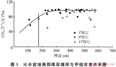 一般取甲烷濃度80%為風(fēng)氧化帶的底界。用不同埋深或不同煤層上覆有效厚度的鉆孔、煤層氣井或煤礦抽放出得煤層氣進(jìn)行氣體組分分析,得出風(fēng)氧化帶的深度。如沁水盆地南部煤層氣藏甲烷組分含量隨煤層埋藏深度的加大而增加,甲烷組分含量大于80%對應(yīng)的煤層埋深為180m,即可確定風(fēng)氧化帶的深度為180m左右(圖1)。