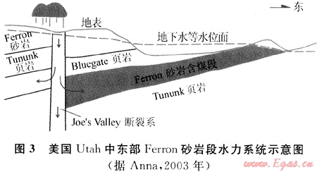 開放性斷層邊界有兩種情形:位于地下水補(bǔ)給區(qū)的開放性斷層和位于地下水排泄區(qū)的開放性斷層。地下水沿位于補(bǔ)給區(qū)的開放性斷層帶補(bǔ)給,分別向斷層兩側(cè)的煤層與含水層運移,對煤層氣的散失起到阻止作用,同時斷層兩側(cè)的含水層和煤層為不同的流體流動單元。因此起到分割不同煤層氣藏的作用。這類斷層邊界有利于煤層氣的保存。而地下水沿位于排泄區(qū)的開放性斷層排泄,造成煤層氣的散失。典型實例見圖3[4]。