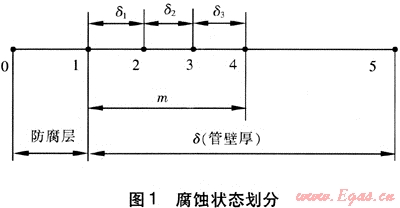 沿壁厚方向將缺陷的發(fā)展劃分成4個階段,見圖1。在模型的實際應用過程中,可根據實際供選擇的維修方式進行腐蝕階段和維修種類的劃分。用△δ表示缺陷的腐蝕深度,在圖1中的點4處,腐蝕深度達到最大,即δ1+δ2+δ3=m。