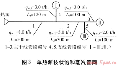 某單熱源枝狀飽和蒸汽管網(wǎng)(見圖3),管段1~5局部阻力當(dāng)量長(zhǎng)度分別為:管段1:1個(gè)截止閥、7個(gè)方形補(bǔ)償器,局部阻力當(dāng)量長(zhǎng)度為166.8m;管段2:1個(gè)直流三通、5個(gè)方形補(bǔ)償器、1個(gè)異徑接頭,局部阻力當(dāng)量長(zhǎng)度為84.8m;管段3:1個(gè)直流三通、2個(gè)方形補(bǔ)償器、1個(gè)異徑接頭、1個(gè)截止閥,局部阻力當(dāng)量長(zhǎng)度為46.3m;管段4:1個(gè)截止閥、1個(gè)分流三通、2個(gè)方形補(bǔ)償器,局部阻力當(dāng)量長(zhǎng)度為37.6m;管段5:管件、閥門設(shè)置與管段4相同,局部阻力當(dāng)量長(zhǎng)度為37.6m。熱源、用戶Ⅰ~Ⅲ的壓力分別為1.0、0.7、0.7、0.7MPa。