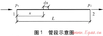 取長(zhǎng)度為L(zhǎng)的蒸汽管段為研究對(duì)象(見圖1),設(shè)管段起始節(jié)點(diǎn)為1,對(duì)應(yīng)壓力為p1;末端節(jié)點(diǎn)為2,對(duì)應(yīng)壓力為p2。