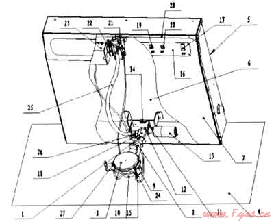 圖中所示:1、噴嘴,2、引射管,3、爐頭,4、櫥柜臺面或桌面,5、灶具主殼體,6、后殼面,7、前殼面,8、孔,9、鍋架,10、爐頭支撐架,11、轉(zhuǎn)軸固定架,12、轉(zhuǎn)軸,13、電動機(jī),14、上限位開關(guān),15、下限位開關(guān),16、控制電路板,17、電源輸入控制開關(guān),18、連接件,19、上升開關(guān),20、下降開關(guān),21、旋塞閥,22、旋鈕,23、脈;中點(diǎn)火器,24、點(diǎn)火針,25、分氣管,26、分氣管接頭,27、熱電偶式熄火保護(hù)裝置,28、進(jìn)氣管。