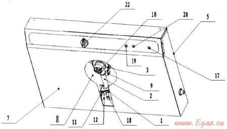 如圖1所示,在本具體實(shí)施例中,本研究項(xiàng)目立式家用燃?xì)庠畎ü鈾C(jī)構(gòu)、點(diǎn)火機(jī)構(gòu)、燃燒機(jī)構(gòu)以及可豎立擺放在櫥柜臺面或桌面4上或安裝在緊挨櫥柜臺面或桌面4的墻壁上的灶具主殼體5,此時灶具主殼體5的高度和寬度都明顯大于其厚度;所述供氣機(jī)構(gòu)包括進(jìn)氣管20、旋塞閥21和旋鈕22,所述進(jìn)氣管28與旋塞閥21相通,所述旋鈕22安裝在旋塞閥21上,所述旋塞閥21通過分氣管25及分氣管接頭26與連接件19連接相通;所述點(diǎn)火機(jī)構(gòu)包括脈;中點(diǎn)火器23和點(diǎn)火針24,所述脈沖點(diǎn)火器23與旋塞閥21連接相通并通過導(dǎo)線與點(diǎn)火針24連接,所述點(diǎn)火針24設(shè)置在爐頭3上;所述燃燒機(jī)構(gòu)包括噴嘴1、引射管2、爐頭3和鍋架9;所述噴嘴1的一端與連接件18連接相通,其另一端與引射管2的一端連接相通;所述引射管2的另一端與爐頭3連接并與爐頭3的火孔相通;所述爐頭3連接有鍋架9:所述灶具主殼體5的后殼面6上連接有轉(zhuǎn)軸固定架11,所述轉(zhuǎn)軸固定架11上設(shè)有一根與其相對轉(zhuǎn)動的轉(zhuǎn)軸12;所述燃燒機(jī)構(gòu)后端的連接件19與灶具主殼體5后殼面6的轉(zhuǎn)軸12連接;所述灶具主殼體5的前殼面7上設(shè)有供燃燒機(jī)構(gòu)在轉(zhuǎn)動過程中通過的孔8,如圖2所示;所述爐頭3底部連接有一個爐頭支撐架10。在本具體實(shí)施例中,本研究項(xiàng)目還在爐頭3邊安裝有熱電偶式熄火保護(hù)裝置27。