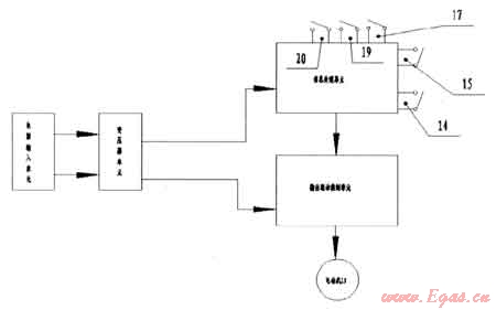 在本具體實(shí)施例中,如圖1和圖2所示,所述轉(zhuǎn)軸12的一端與設(shè)置在灶具主殼體5內(nèi)的電動機(jī)13的轉(zhuǎn)軸連接;所述轉(zhuǎn)軸固定架11上設(shè)有上限位開關(guān)14;所述燃燒機(jī)構(gòu)前端設(shè)有下限位開關(guān)15;所述電動機(jī)13、上限位開關(guān)14及下限位開關(guān)15均與控制電路板16電連接;所述控制電路板1 6 1-還電連接有電源輸入控制開關(guān)17、上升開關(guān)19及下降開關(guān)20。所述的電動機(jī)13、上限位開關(guān)14、下限位開關(guān)15、上升開關(guān)19、下降開關(guān)20以及控制電路板16組成一個可控制轉(zhuǎn)軸12轉(zhuǎn)動的轉(zhuǎn)軸自動轉(zhuǎn)動裝置。