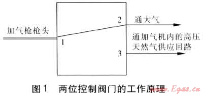三位控制閥門的3個端口分別對應3個通道:1-2排空通道;1-2A回收通道;1-3加氣通道。