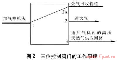 回收排空天然氣的核心部件是一個三位控制閥門,用于替代原兩位控制閥門。它與原加氣槍上的兩位控制閥外形尺寸一致,操作過程也基本一樣,不增加操作難度和工作量,且具有同等的安全可靠性。其工作原理見圖2。