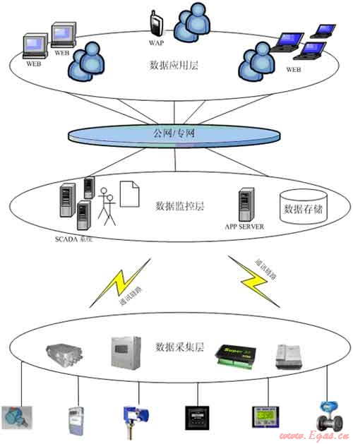 通用SCADA系統(tǒng)可分為3層。第1層為數(shù)據(jù)采集層,由RTU與一次儀表構(gòu)成,完成現(xiàn)場原始數(shù)據(jù)的采集與預(yù)處理。根據(jù)設(shè)計(jì)需求還可以實(shí)現(xiàn)現(xiàn)場的數(shù)據(jù)存儲,以保證通訊中斷后數(shù)據(jù)的連續(xù)性;第2層為數(shù)據(jù)監(jiān)控層。在這層將利用各種軟件遠(yuǎn)程仿真現(xiàn)場,實(shí)現(xiàn)數(shù)據(jù)的實(shí)時監(jiān)控、實(shí)時報(bào)警。該層可根據(jù)對應(yīng)的管理模式再分為分控中心、總控中心等,還可根據(jù)設(shè)計(jì)需求進(jìn)行大量歷史數(shù)據(jù)的存儲;第3層為數(shù)據(jù)應(yīng)用層。在應(yīng)用層實(shí)現(xiàn)對已采集數(shù)據(jù)的分析、整理,并根據(jù)需要實(shí)現(xiàn)多種形式的發(fā)布。業(yè)界很多公司分別在數(shù)據(jù)采集層、數(shù)據(jù)監(jiān)控層、數(shù)據(jù)應(yīng)用層都擁有極其穩(wěn)定的產(chǎn)品和豐富的系統(tǒng)集成經(jīng)驗(yàn)。