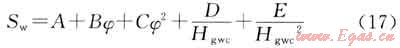6) 利用測井所得的孔隙度和氣水界面高度,根據(jù)低侵巖心分析的含水飽和度和孔隙度采用二項式回歸公式計算,氣水過渡帶盡管沒有巖心含水飽和度,但是通過利用巖心毛細(xì)管壓力資料建立J函數(shù)飽和度模型后可以獲取過渡帶飽和度數(shù)據(jù),因此綜合油基鉆井液密閉心飽和度及毛細(xì)管壓力飽和度資料建模,可同時兼顧氣藏主體高部位及過渡帶,其模型如下: